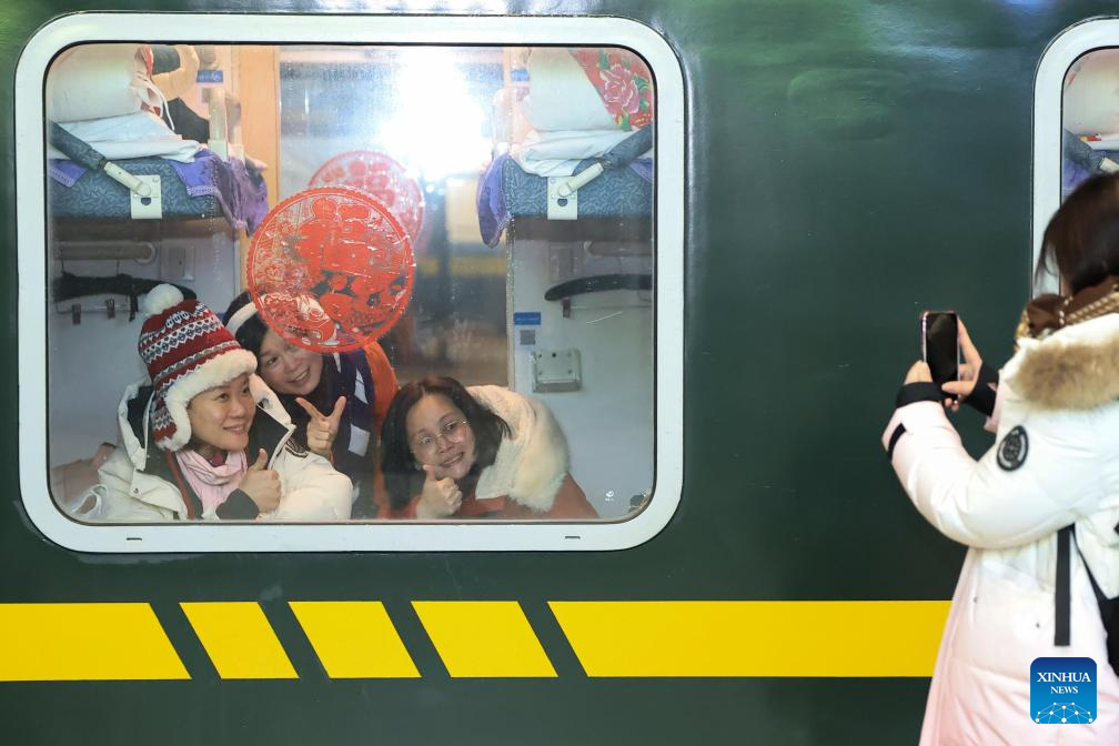 2026年1月19日,黑龙江,外国游客在K7041次东北民俗文化主题列车上合影留念。近期,来自东南亚国家的游客以前所未有的热情涌入被誉为中国“冰城”的哈尔滨。新华社发(徐帅摄)