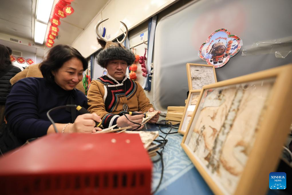 2026年1月19日,黑龙江,马来西亚游客(左)在K7041次东北民俗文化主题列车上体验鄂伦春族绘画技艺。近期,来自东南亚国家的游客以前所未有的热情涌入被誉为中国“冰城”的哈尔滨。新华社发(徐帅摄)