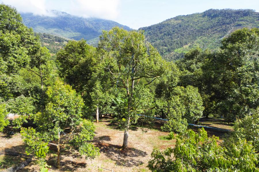 2025 年 10 月 16 日无人机拍摄的照片显示了马来西亚彭亨州劳勿市的一个榴莲果园。新华社发(程以恒摄)