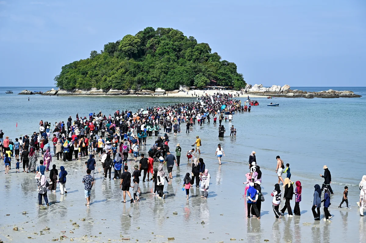 在独特的退潮期间,超过 3,000 名游客涌向直落尼帕海滩,步行穿过连接吉岩岛的罕见沙洲。