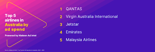 根据 Nielsen Ad Intel 的数据,在旅行社和旅游运营商中,Flight Center 在 2025 年的广告支出市场中处于领先地位,其次是 Booking.com、Scenic Tours Australia、Ignite Travel 和 TripADeal。