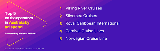 游轮广告也有所增长,增长了 9%,反映出澳大利亚人对游轮日益增长的兴趣,56% 的潜在旅行者表示他们会“考虑乘坐游轮”。 维京河游轮位居游轮广告支出榜首,其次是银海游轮、皇家加勒比国际游轮、嘉年华游轮和挪威游轮。