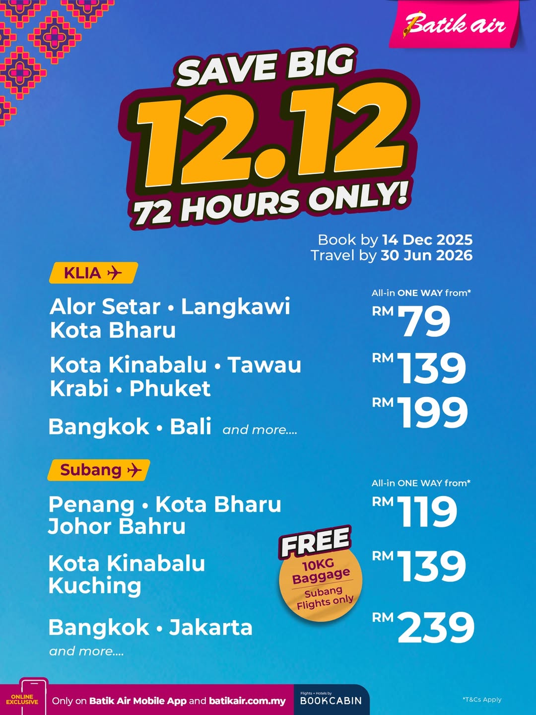 为了纪念这一势头,Bavani 还宣布了 Batik Air 的“Save Big This 12.12”促销活动,该促销活动从昨天到周日。在此期间预订的旅客可以获得 2026 年 6 月之前有效的旅行折扣票价,为自发度假、家庭度假或长期计划的旅行提供价值。